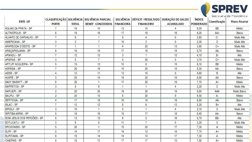 DA NOVA PORTARIA: CAP. XX - REGULAÇÃO PROPORCIONAL. . . PERFIL RISCO= PORTE+RISCO Porte: Estados e DF: Porte 1; Capitais: Porte 2 Municípios (população x quantidade segurados RPPS): Portes 3 a 7 Dados: CADPREV, SICONFI Vinculação: ISP; Pró-Gestão RPPS RISCO - INDICADORES: 1. Solvência Benefícios Concedidos (ativo líquido/RMBC); 2. Solvência Geral (ativos/RMT); 3. Solvência Financeira (contribuições/ benefícios pagos); 4. Resultado Atuarial/Resultado Financeiro 5. Duração Saldo Acumulado