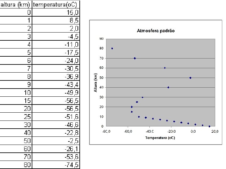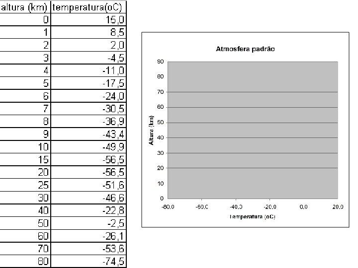 Atividade: • 1. Plotar em papel milimetrado a seguinte sondagem: • 2. Calcular a taxa de variação vertical da temperatura: • da troposfera nos primeiros 10 km; • da estratosfera, entre 20 e 50 km; • da mesosfera, entre 50 e 80 km.