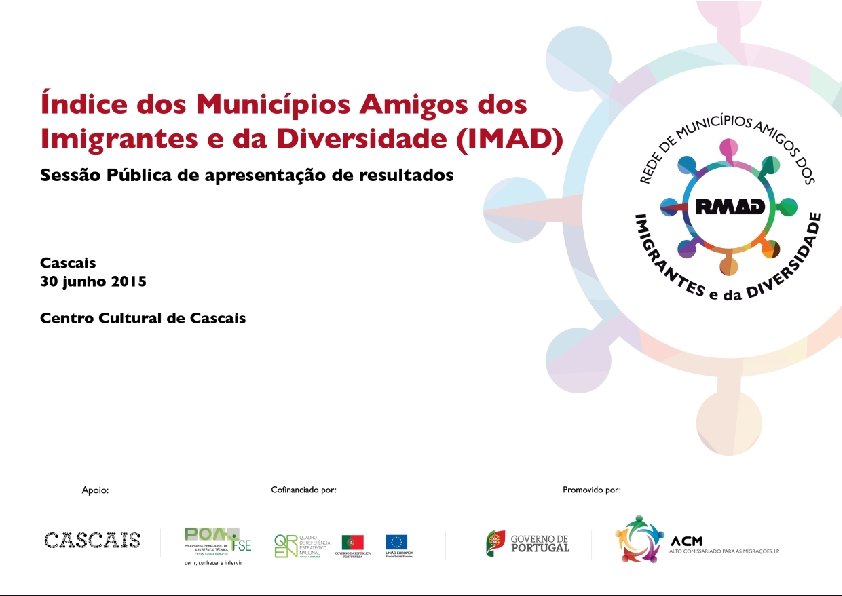 Ferramenta IMAD e Pressupostos • São consideradas as respostas direcionadas aos imigrantes e seus descendentes independentemente da sua nacionalidade. São igualmente consideradas as respostas direcionadas a toda a população (nacionais e estrangeiros), no caso da promoção da interculturalidade, desde que as mesmas visem a integração efetiva dos imigrantes e seus descendentes na sociedade portuguesa. • A informação reportada refere-se maioritariamente ao anterior e ao ano corrente (à data da inquirição). • A informação reportada baseia-se na apresentação de factos e, sempre que possível, em evidências (dados de fontes oficiais ou de informações recolhidas no município / notícias publicadas nos media locais / atas de reuniões da Rede Social, conselhos municipais ou de outras estruturas locais / entre outras).