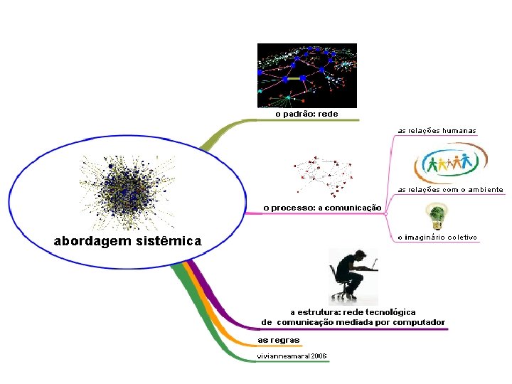 Redes organizacionais A comunicação é mediada por o: computador conectad email, MSN, listas de discussão, skype, plataformas colaborativas. operativas redes de articulação sociotécnicas - redes de ação, com uma tarefa, missão, - articulações em rede como estratégia para alcançar objetivos - a rede como meio