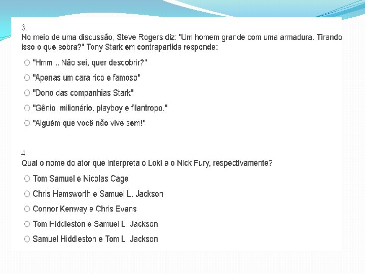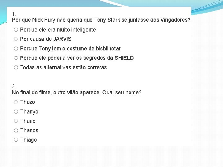 GABARITO 1 - Todas as alternativas estão corretas 2 - Thanos 3 - "Gênio, milionário, playboy e filantropo. “ 4 - Tom Hiddleston e Samuel L. Jackson 5 - "You Have a Heart!" (Você tem um coração!)