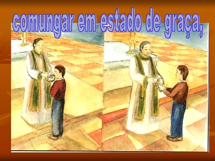 A igreja é um lugar sagrado por causa da presença de Jesus no Sacrário. … sentimo-nos ansiosos, agitados, angustiados, preocupados… Entramos na igreja, Jesus-Eucaristia está à nossa espera… ELE CURA-NOS A igreja é a nossa casa, lá está Jesus: Ele é nosso irmão, juntos formamos a Igreja/família de Deus.