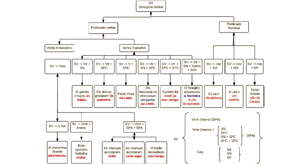 Regras do sintagma verbal • 1. É obrigatório na oração • 2. Deve ter como núcleo um verbo de ação ou um verbo copulativo (de ligação) • 3. Caso tenha um verbo de ação • 3. 1 ele pode ser intransitivo ou transitivo • 3. 1. 1 caso seja intransitivo, pode ter um modificador e ou um sintagma preposicionado adjunto (Spa) • 3. 1. 2 caso seja transitivo, • 3. 1. 2. 1 tem de ter um complemento que deve ser, obrigatoriamente, um SN • 3. 1. 2. 2 pode ter um sintagma preposicional anterior ao SN que pode ter um intensificador e deve ter um sintagma preposicionado adjunto (Spa) • 3. 1. 2. 3 pode ter um sintagma preposicional como complemento (SPc) • 4. Caso seja copulativo • 4. 1 Deve ter um sintagma nominal • 4. 2 Pode ter um sintagma adjetival • • 4. 2. 1 Pode ter um sintagma preposicional adjunto 4. 2. 2 Pode ter um intensificador 4. 2. 3 Deve ter um adjetivo 4. 2. 4 Pode ter um sintagma preposicional complemento • 4. 3 Pode ter um sintagma preposicional