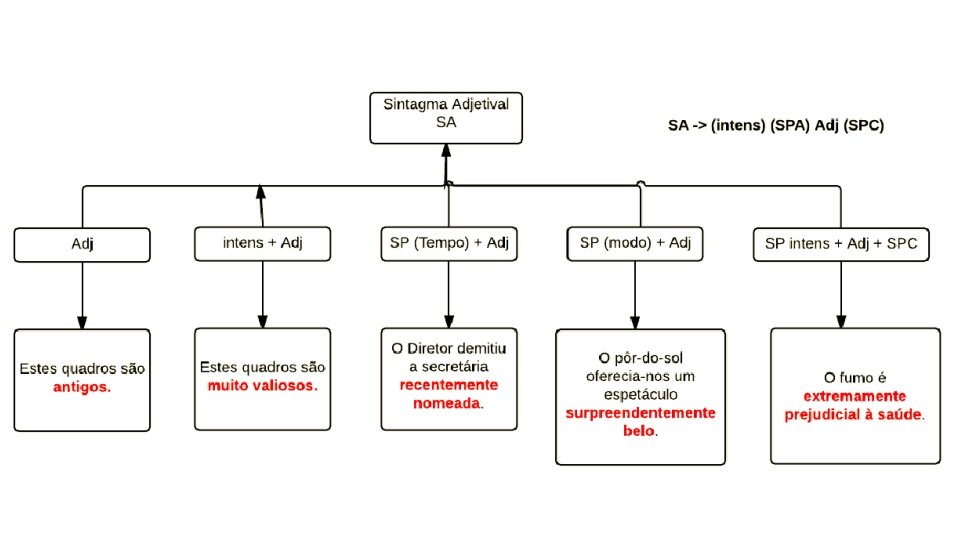 Regras do sintagma adjetival • 1. Não é obrigatório • 2. Se existir, deve ter, • 2. 1 obrigatoriamente • 2. 1. 1 um adjetivo • 2. 2. opcionalmente • 2. 2. 1 um intensificador • 2. 2. 2 um sintagma preposicionado adjunto (SPa) que pode ser de tempo, de modo, de lugar, de instrumento • 2. 2. 3 um sintagma preposicionado complemento (SPc).