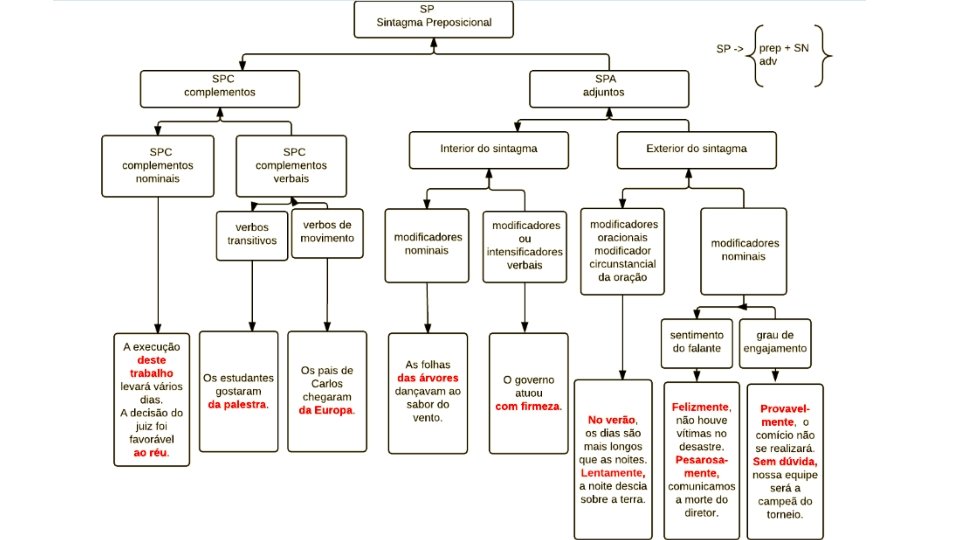 Regras do sintagma preposicionado • 1. Não é obrigatório • 2. Se existir, deve ter, • 2. 1 obrigatoriamente • 2. 1. 1 um advérbio • 2. 2. opcionalmente • 2. 2. 1 um sintagma preposicionado que é uma locução adverbial • 2. 2. 2 um sintagma nominal • 2. 2. 2. 1 um sintagma preposicionado adjunto (SPa) que pode ser de tempo, de modo, de lugar, de instrumento