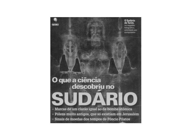 CONCLUSÕES CIENTÍFICAS DA STURP • A equipe americana do STURP (Shoud of Turin Research Project), após três anos e cerca de 100. 000 horas de pesquisa, apontou as seguintes conclusões: 1 - Havia sangue humano no sudário. 2 - As gotículas de tinta ocre seriam resultado de contaminação. 3 - A habilidade e equipamentos necessários para gerar uma falsificação daquela natureza seriam incompatíveis com o período da Idade Média, época em que o sudário apareceu e foi guardado;