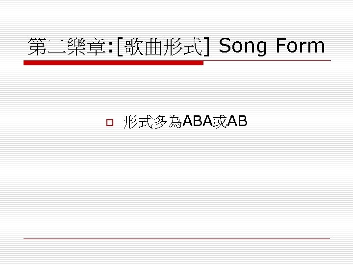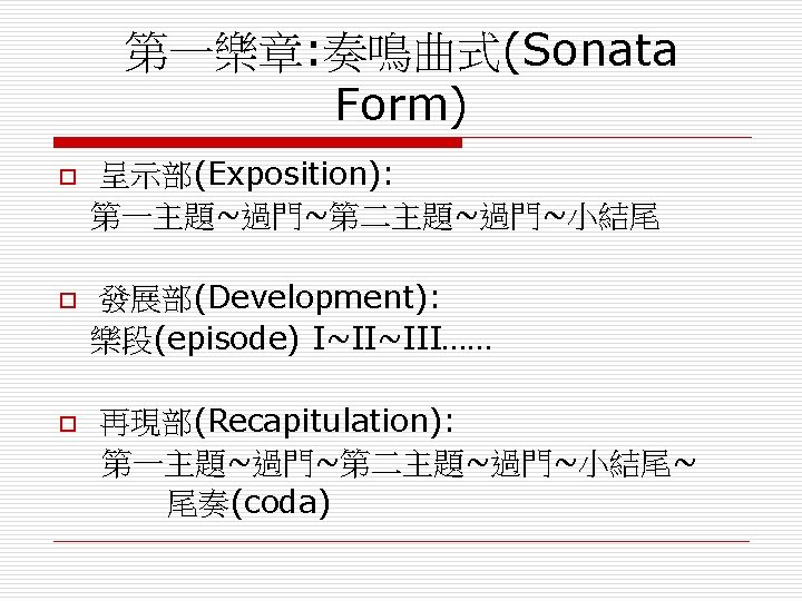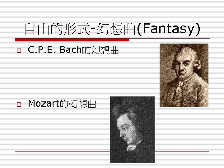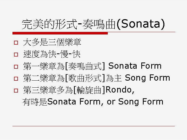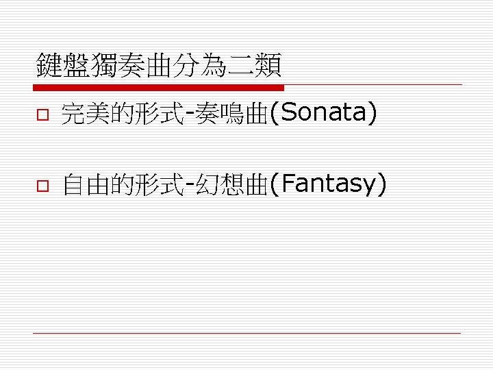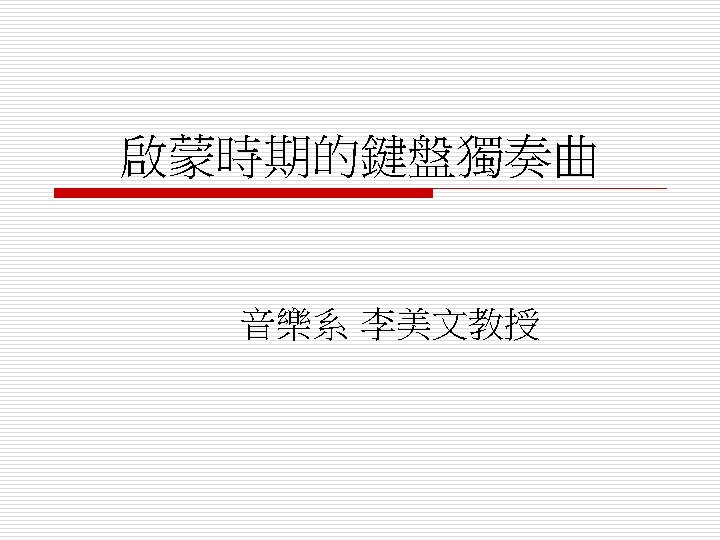 o Wolfgang Amadeus Mozart 1756 1791 Sonata in Slides: 18 Download presentation 建議聆聽曲目 o Wolfgang Amadeus Mozart 莫札特 (1756 -1791) Sonata in C Major KV. 330 mov. I 建議聆聽曲目 o o Wolfgang Amadeus Mozart 莫札特 (1756 -1791) Sonata in C Major KV. 330 mov. II 形式: ABA 第三樂章: 輪旋曲曲式 o o o ABACABA ABACADA 建議聆聽曲目 Wolfgang Amadeus Mozart 莫札特 (1756 -1791) Sonata in C Major KV. 545 mov. III 曲式: ABACA+尾奏 (coda) 省略 8 18 14 IV 建議聆聽曲目 o Wolfgang Amadeus Mozart 莫札特 (1756 -1791) Fantasy in D Minor 謝謝 Thank you!