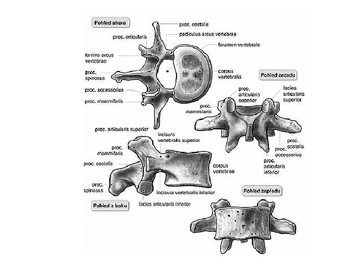 Obecná charakteristika obratle: • • corpus vertebrae facies terminalis super. , inf. arcus vertebrae foramen vertebrale canalis vertebralis pediculus arcus vertebrae incisura intervertebralis super. , inf. • foramen intervertebrale Výběžky: • Processus spinosus • processus transversus • processus articulares super. , inf. ,
