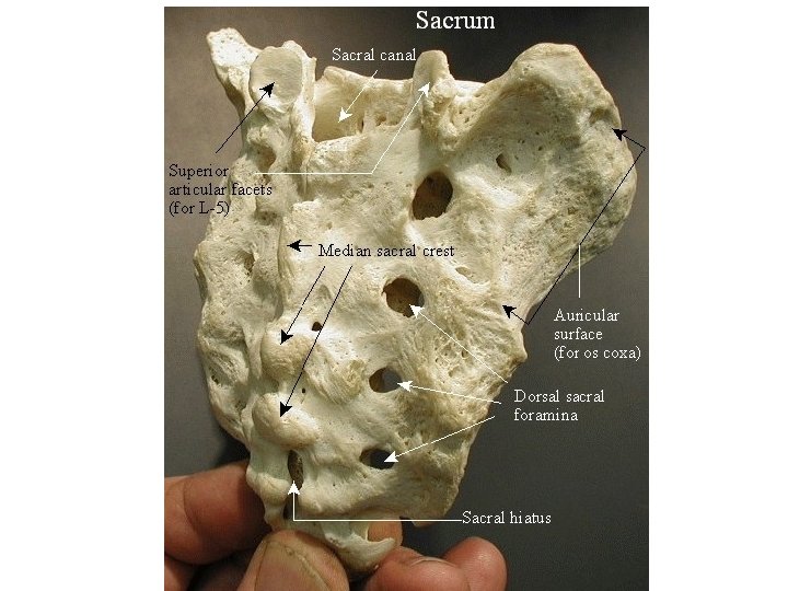 2. Facies dorsalis – konvexní plochou • crista sacralis mediana – srostlé trnové výběžky • crista sacralis intermedia - splynulé kloubní výběžky • foramina sacralia dorsalia • cornua sacralia • hiatus sacralis • crista sacralis lateralis splynulé transverzální výběžky