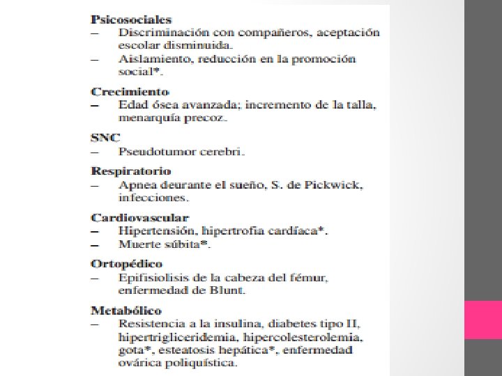 EXCESO DE GRASA CORPORAL FENOTIPO NORMAL DISMORFICO TALLA SINDROMES NORMAL O ELEVADA BAJA MADURACION OSEA NORMAL O ACELERADA MADURACIO N OSEA RETRASADA MADURACIO N OSEA ACELERADA OBESIDAD NUTRICIONAL ENDOCRINOPATIAS: HIPOTIROIDISMO ENDOCRINOPATIAS: MAURIAC CORTICODES PUBERTAD PRECOZ CUSHING