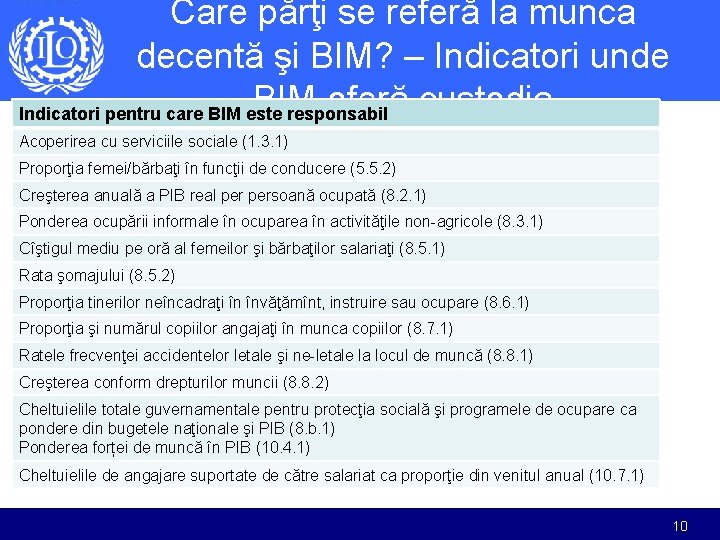 Care părţi se referă la munca decentă şi BIM? – Indicatori unde BIM oferă custodia Indicatori pentru care BIM este responsabil Acoperirea cu serviciile sociale (1. 3. 1) Proporţia femei/bărbaţi în funcţii de conducere (5. 5. 2) Creşterea anuală a PIB real persoană ocupată (8. 2. 1) Ponderea ocupării informale în ocuparea în activităţile non-agricole (8. 3. 1) Cîştigul mediu pe oră al femeilor şi bărbaţilor salariaţi (8. 5. 1) Rata şomajului (8. 5. 2) Proporţia tinerilor neîncadraţi în învăţămînt, instruire sau ocupare (8. 6. 1) Proporţia şi numărul copiilor angajaţi în munca copiilor (8. 7. 1) Ratele frecvenţei accidentelor letale şi ne-letale la locul de muncă (8. 8. 1) Creşterea conform drepturilor muncii (8. 8. 2) Cheltuielile totale guvernamentale pentru protecţia socială şi programele de ocupare ca pondere din bugetele naţionale şi PIB (8. b. 1) Ponderea forței de muncă în PIB (10. 4. 1) Cheltuielile de angajare suportate de către salariat ca proporţie din venitul anual (10. 7. 1) 10