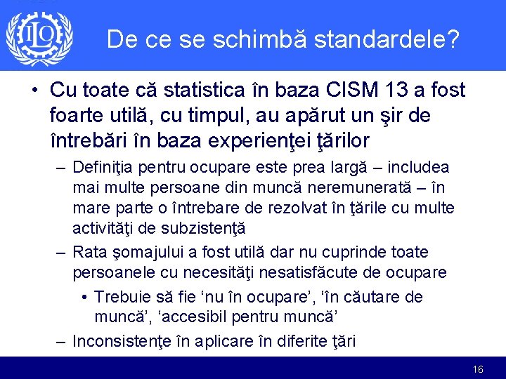 Contextul CISM 19 • Standardele statistice pentru întrebările ce ţin de forţa de muncă sunt aprobate fiecare 5 ani la Conferinţa Internaţională a Statisticienilor Muncii, găzduită de BIM • Standardele acoperă diferite teme, cum ar fi munca, programul de muncă, cîştiguri, preţurile de consum, etc. • Standardele existente privind piaţa muncii (cum ar fi, de exemplu, cele produse în cadrul Anchetei Forţei de Muncă) se bazează pe standardele aprobate în 1982 (CISM 13) – Definiţia pentru ocupare şi şomaj 15