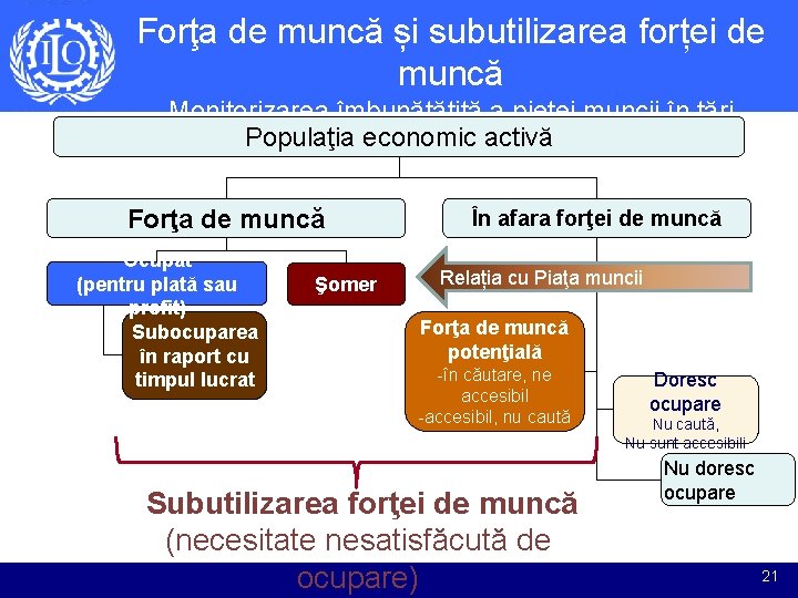 Forţa de muncă și subutilizarea forței de muncă Monitorizarea îmbunătăţită a pieţei muncii în ţări Populaţia economic activă Forţa de muncă Ocupat (pentru plată sau profit) Subocuparea în raport cu timpul lucrat Şomer În afara forţei de muncă Relația cu Piaţa muncii Forţa de muncă potenţială -în căutare, ne accesibil -accesibil, nu caută Subutilizarea forţei de muncă (necesitate nesatisfăcută de ocupare) Doresc ocupare Nu caută, Nu sunt accesibili Nu doresc ocupare 21