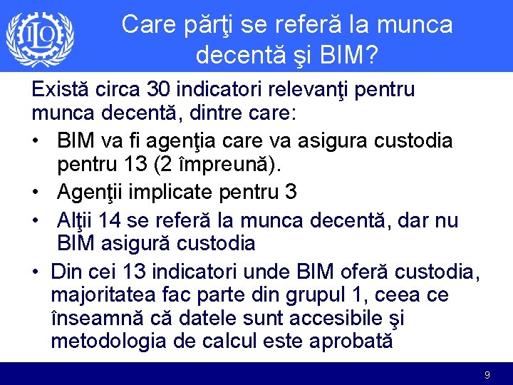 Care părţi se referă la munca decentă şi BIM? Există circa 30 indicatori relevanţi pentru munca decentă, dintre care: • BIM va fi agenţia care va asigura custodia pentru 13 (2 împreună). • Agenţii implicate pentru 3 • Alţii 14 se referă la munca decentă, dar nu BIM asigură custodia • Din cei 13 indicatori unde BIM oferă custodia, majoritatea fac parte din grupul 1, ceea ce înseamnă că datele sunt accesibile şi metodologia de calcul este aprobată 9