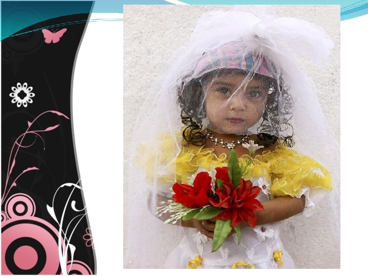 -česta su vjenčanja male djece -djevojčice se udaju prije početka puberteta i to za obično puno starije muškarce -od njih se očekuje da zatrudne čim stupe u pubertet -broj takvih ilegalnih vjenčanja se povećava -one moraju napustiti roditeljsku kuću i živjeti sa suprugovom obitelji, tamo obavljaju razne poslove -i takve djevojčice mogu imati kasnije zdravstvenih problema, npr. mnogo njih umire pri porođaju, a i u takvim brakovima česta su silovanja te se tijelo djevojčice može uništiti
