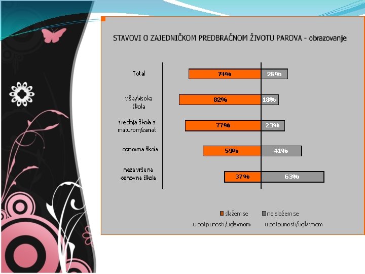 Sudionici 505 bračnih parova sa područja Zagreba i Zagrebačke županije Naznaka na naobrazbu muževa: 32% završena ili nezavršena osnovna škola 43% završena srednja škola 25% završena viša škola ili fakultet