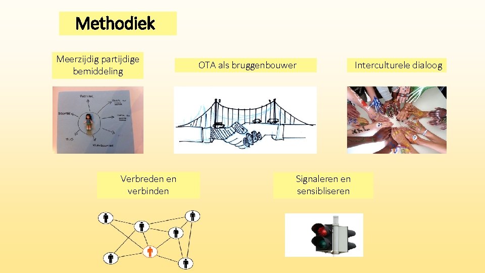 Methodiek Meerzijdig partijdige bemiddeling Verbreden en verbinden OTA als bruggenbouwer Signaleren en sensibliseren Interculturele dialoog
