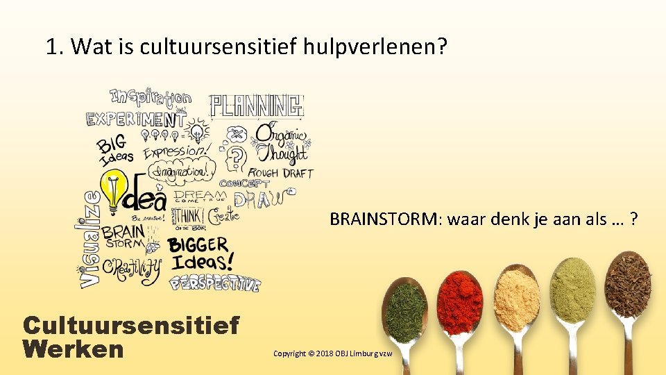 1. Wat is cultuursensitief hulpverlenen? BRAINSTORM: waar denk je aan als … ? Cultuursensitief Werken Copyright © 2018 OBJ Limburg vzw