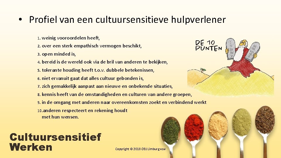 • Profiel van een cultuursensitieve hulpverlener 1. weinig vooroordelen heeft, 2. over een sterk empathisch vermogen beschikt, 3. open minded is, 4. bereid is de wereld ook via de bril van anderen te bekijken, 5. tolerante houding heeft t. o. v. dubbele betekenissen, 6. niet ervanuit gaat dat alles cultuur gebonden is, 7. zich gemakkelijk aanpast aan nieuwe en onbekende situaties, 8. kennis heeft van de omstandigheden en culturen van andere groepen, 9. in de omgang met anderen naar overeenkomsten zoekt en verbindend werkt 10. anderen respecteert en rekening houdt met hun wensen. Cultuursensitief Werken Copyright © 2018 OBJ Limburg vzw