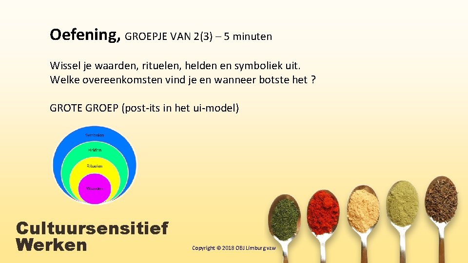 Oefening, GROEPJE VAN 2(3) – 5 minuten Wissel je waarden, rituelen, helden en symboliek uit. Welke overeenkomsten vind je en wanneer botste het ? GROTE GROEP (post-its in het ui-model) Cultuursensitief Werken Copyright © 2018 OBJ Limburg vzw
