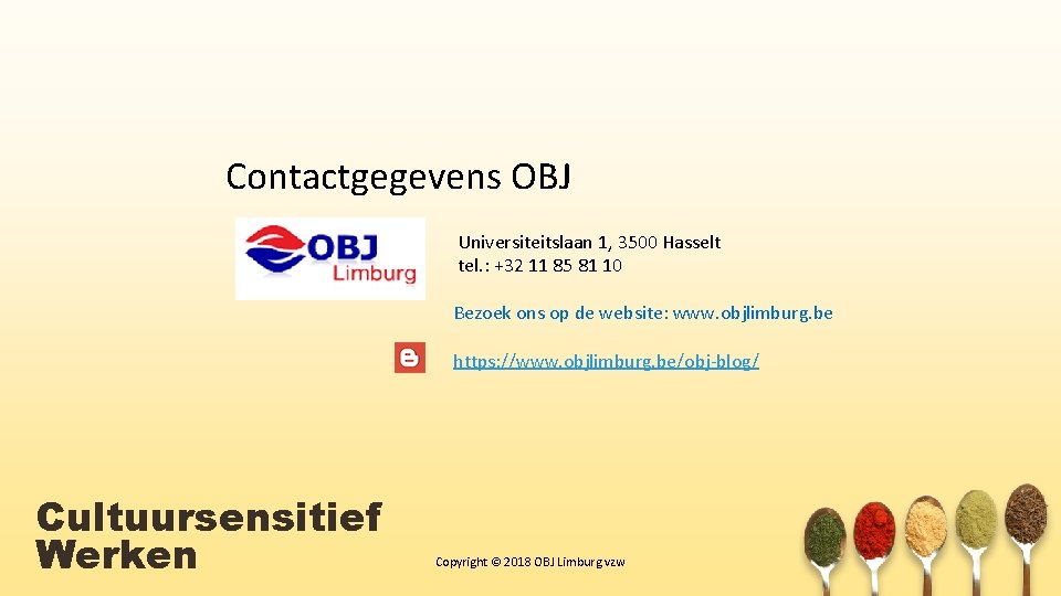 Contactgegevens OBJ Universiteitslaan 1, 3500 Hasselt tel. : +32 11 85 81 10 Bezoek ons op de website: www. objlimburg. be https: //www. objlimburg. be/obj-blog/ Cultuursensitief Werken Copyright © 2018 OBJ Limburg vzw