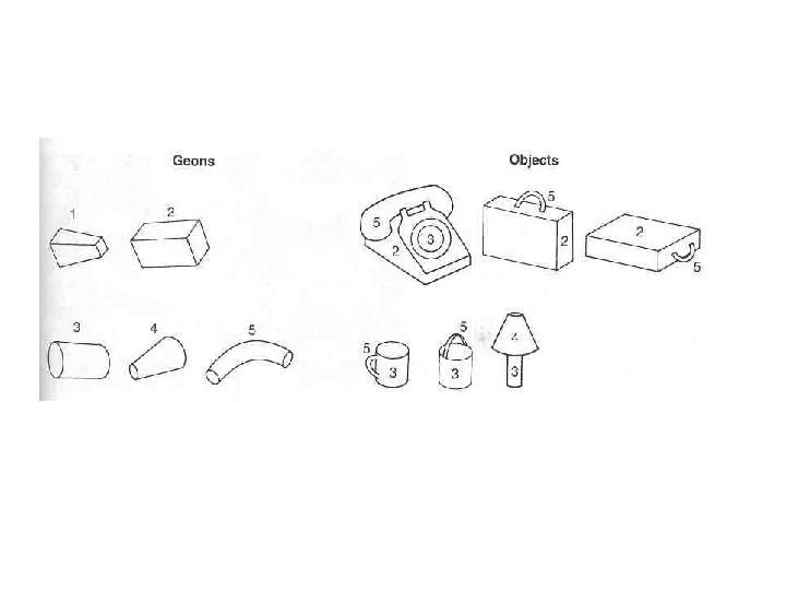 Geons (Biederman) • According to geon theory, complex objects are made up of arrangements of basic, component parts ('geons') • Some evidence for the psychological reality of geons comes from experiments that show that recognition is impaired when we hide the intersections of geons • However, occluding these intersections also changes the picture in many other ways