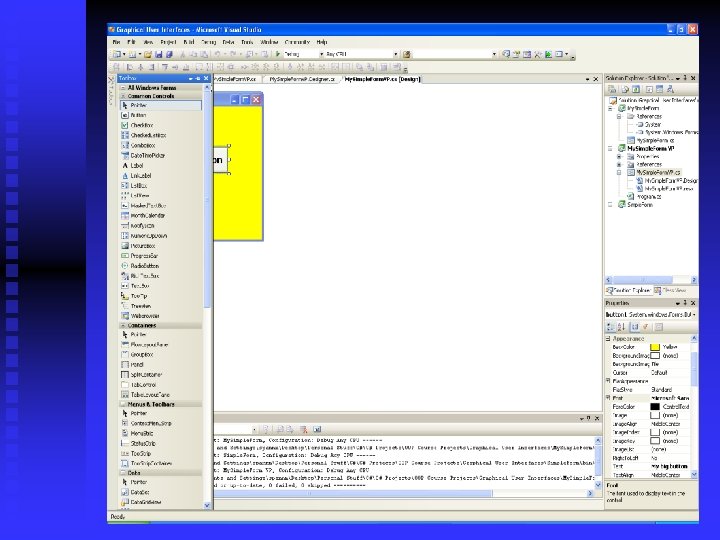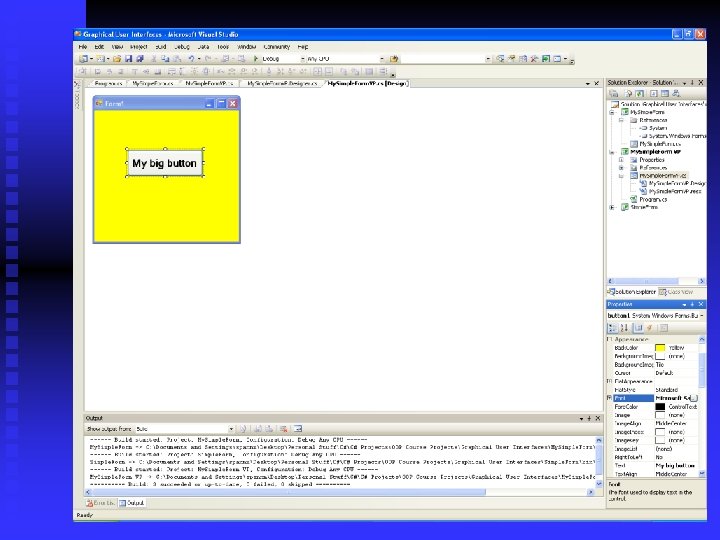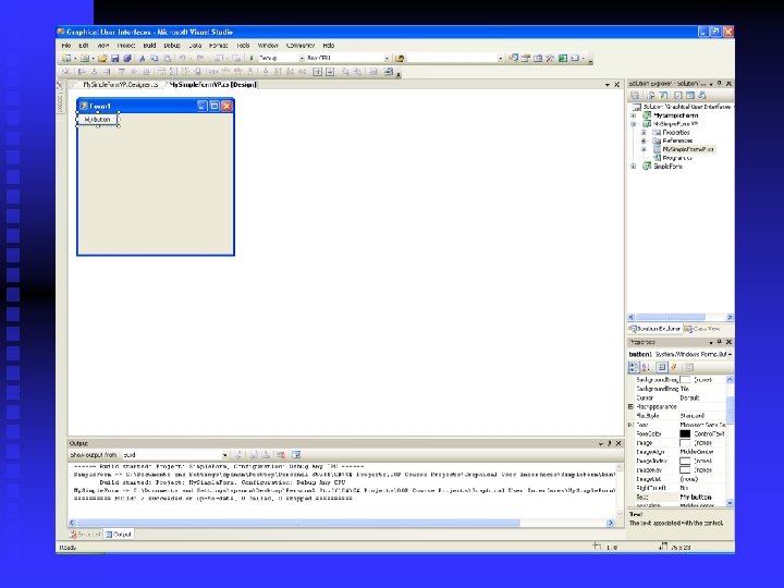 namespace My. Simple. Form_VP { partial class Form 1 {. . . #region Windows Form Designer generated code private void Initialize. Component() { this. button 1 = new System. Windows. Forms. Button(); this. Suspend. Layout(); // // button 1 // this. button 1. Location = new System. Drawing. Point(-1, 0); this. button 1. Name = "button 1"; this. button 1. Size = new System. Drawing. Size(75, 23); this. button 1. Tab. Index = 0; this. button 1. Text = "My button"; this. button 1. Use. Visual. Style. Back. Color = true; this. button 1. Click += new System. Event. Handler(this. button 1_Click); // // Form 1 // this. Auto. Scale. Dimensions = new System. Drawing. Size. F(6 F, 13 F); this. Auto. Scale. Mode = System. Windows. Forms. Auto. Scale. Mode. Font; this. Client. Size = new System. Drawing. Size(292, 266); this. Controls. Add(this. button 1); this. Name = "Form 1"; this. Text = "Form 1"; this. Resume. Layout(false); } #endregion private System. Windows. Forms. Button button 1; } }
