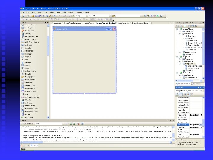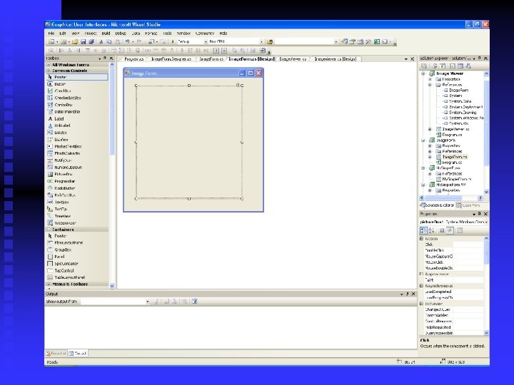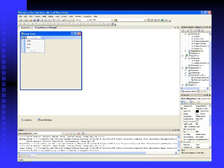 Example – A simple image viewer n We can create a separate windows application comprising a Form containing a Picture. Box u The Picture. Box class has an Image property which is the image it is displaying u The Load() event handler displays the image when the form is created u All very easy to do in design view of VS