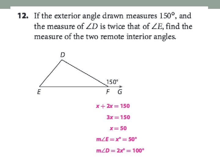 Each exterior angle has two remote interior angles. A remote interior angle is an interior angle that is not adjacent to the exterior angle. 4 is an exterior angle. Exterior The remote interior angles of 4 are 1 and 2. Interior 3 is an interior angle.