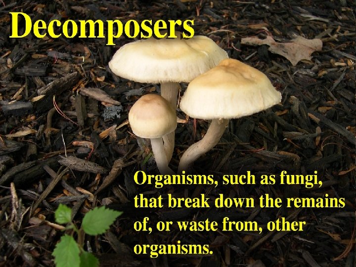What do Decomposers Do? ? ? After scavengers break dead remains into smaller parts, n these smaller pieces are eaten by decomposers. n Decomposers eat animal and plant remains n Decomposers convert all remains into carbon dioxide (which they exhale during respiration) and nutrients. (DECOMPOSERS ARE PART OF THE CARBON CYCLE) n