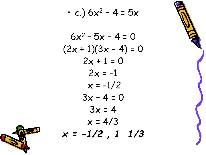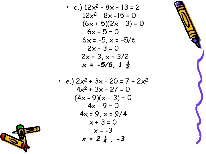 Ex. 1, Solve each quadratic equation. a. ) 15 x 2 – 93 x = -18 15 x 2 – 93 x + 18 = 0 3(5 x 2 – 31 x + 6) = 0 3(x – 6)(5 x -1) = 0 x – 6 = 0, x = 6 5 x – 1 = 0 5 x = 1/5 x = 6, 1/5