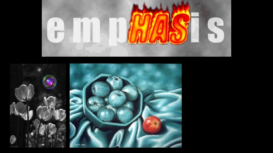 What is emphasis? Emphasis draws attention to an object. Emphasis creates a focal point and makes object stand out. How do you create emphasis? Using contrast…of color, size, form, shape, etc… Dark vs. light, color vs. black and white, warm vs. cool Which object(s) are you going to emphasize using color?