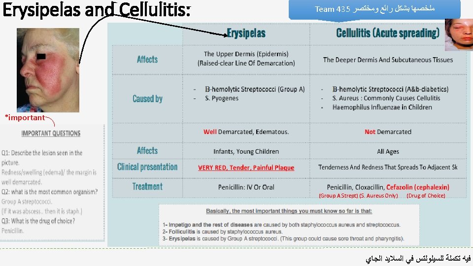 Necrotizing Fasciitis: Treatment: • • If clinically suspected patient needs to be hospitalized OR require admission to ICU(intensive care unite). Start intravenous antibiotics immediately. Antibiotic selection based on bacteria suspected. broad spectrum antibiotic combinations against: • MRSA: methicillin-resistant Staphylococcus aureus (MRSA) • Anaerobic bacteria • Gram-negative and gram-positive Bacilli Surgeon consultation : ** • Extensive Debridement of necrotic tissue and collection of tissue samples • Can reduce morbidity and mortality Antibiotics combinations : • Penicillin/clindamycin/gentamicin. (Given together, and they’re the most important) • Ampicillin/sulbactam • Cefazolin plus metronidazol • Piperacillin/tazobactam • Clostridium perfringens - penicillin G • Hyperbaric oxygen therapy (HBO) treatment ** important (team 435) https: //www. youtube. com/watch? v=tu. RCq 4 nyn 2 Y