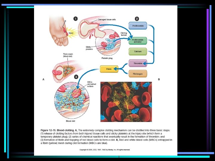 Blood Clotting • 1. Release of clotting factors from both injured tissue cells and sticky platelets at the injury site (platelet plug) • Clotting factors: • prothrombin (a protein in normal blood) • prothrombin activator (formed when clotting factors in damaged cells react with plasma) • normal amount of blood calcium