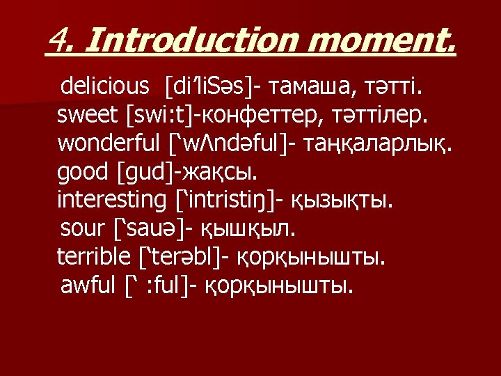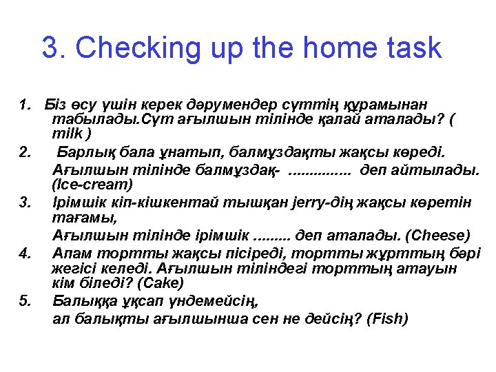 Objectives: 1. To develop hearing and speaking skills on speech level on the material covered; 2. To develop pupils’ abilities in enlarging sentences; 3. To teach pupils the new words, that they can use it speaking in sentence
