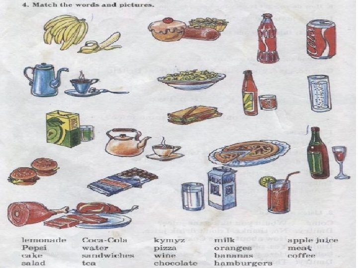 Food Drink meat cake lemonade pepsi salad sandwiches pizza chocolate bananas hamburgers oranges coca-cola water tea kumyz wine milk apple juice coffee