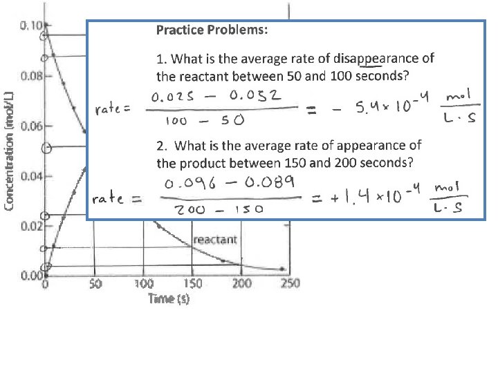 Reactant Concentration vs. Time Disappearance of reactant X For the equation: X Y What is the average “rate of disappearance” between 5 and 10 min?