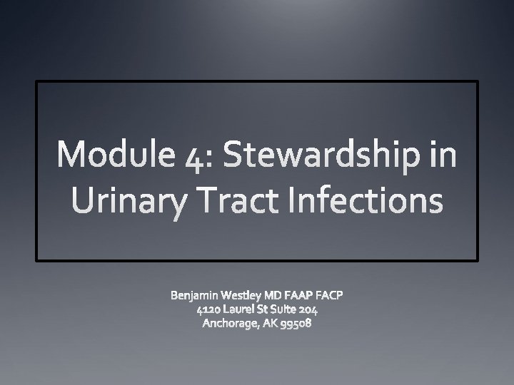 Objectives Categorize urinary tract infections by group Asymptomatic bacteriuria Cystitis Pyelonephritis Complicated urinary tract infection/Catheter-associated UTI Recognize how to distinguish “Infection” from “Bacteriuria” and when to NOT given antibiotics for “UTI” Discuss the approach to cystitis Define pyelonephritis and identify evidence-based therapies Consider complicated pyelonephritis, catheter-associated UTI (CA-UTI) and treatment of highly-resistant organisms