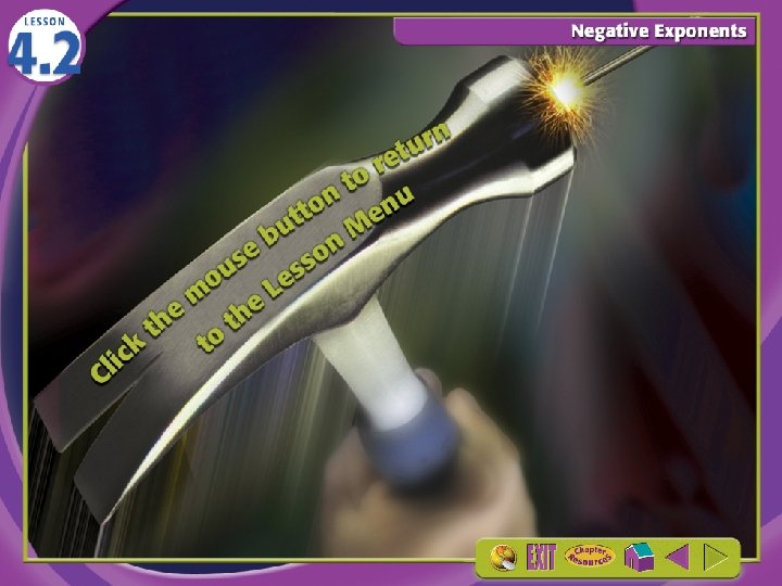 • To relate negative exponents to both multiplication by fractions and repeated division • To evaluate simple expressions with negative exponents • To apply laws of exponents to expressions with negative exponents • To write numbers in scientific notation with negative exponents