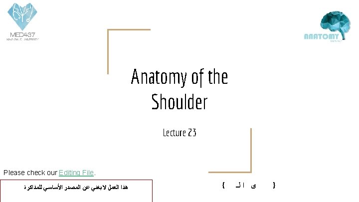 Objectives ● List the name of muscles of the shoulder region. ● Describe the anatomy of muscles of shoulder ● region regarding: attachments of each of them to scapula & humerus, nerve supply and actions on shoulder joint ● List the muscles forming the rotator cuff and describe the relation of each of them to the shoulder joint. ● Describe the anatomy of shoulder joint regarding: type, articular surfaces, stability, relations & movements. ● ● Text in BLUE was found only in the boys’ slides Text in PINK was found only in the girls’ slides Text in RED is considered important Text in GREY is considered extra notes