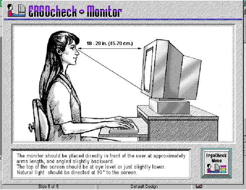 DOCUMENT PLACEMENT n n n Minimize neck twisting by bringing document close to monitor Reduce focus-refocus eyestrain by positioning the document at about the same distance as the monitor screen Eyestrain leads to headaches, general body fatigue and muscle tension