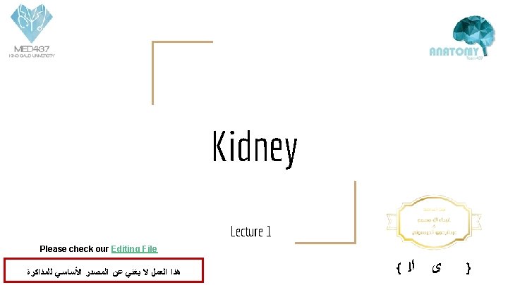 Kidney (Renal) • • Kidneys are reddish brown in color. • • They are largely under cover of the costal margin. • • • The upper border of the right kidney is at the level of 11 th intercostal space. • • • Lie behind the peritoneum on the posterior abdominal wall on either side of the vertebral column. (T 12 -L 3) The right kidney lies slightly lower than the left due to the large size of the right lobe of the liver. The upper border of the left kidney is at the level of 11 th rib. With contraction (inspiration) of the diaphragm the kidney moves downward as much as 2. 5 cm. The lateral border is convex, while the medial border is convex at both ends but its middle pat shows a vertical slit called the hilum. The hilum extends into a large cavity called the renal sinus. The hilum transmits the renal Vein, two branches of renal Artery, Ureter, and the third branch of renal Artery. • From the front backward (V. A. U. A. ) You should know how to differentiate between right and left kidney Renal sinus