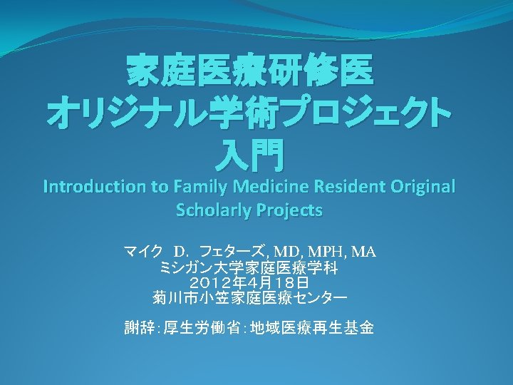 UFMとSFMの中核的活動としてのオリジナル プロジェクト Original Project as Core UFM and SFM activity �オリジナル学術プロジェクトは、ミシガン大学家庭医療科 における研修医教育の最重要ポイントである Original Scholarly Project is a highlight of residency training at the University of Michigan Department of Family Medicine �SFMでも中核的活動となり、あなた方を日本の他の研修 医から際立( )たせることになるでしょう Will become central at kiwada SFM and distinguish you from other residents in Japan �プライマリケア連合学会の必修科目requirement by primary care association