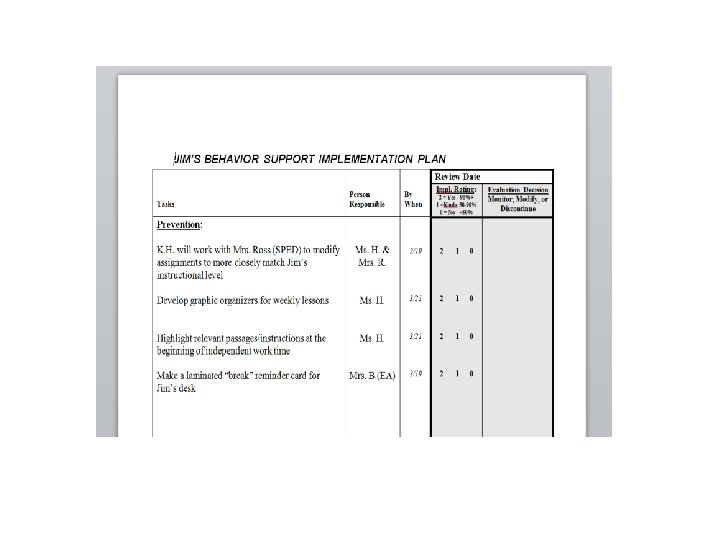 Activity #1(pg. 6. 6) Using the Implementation Plan template on page 6. 7, work with a partner to list the specific activities that might be involved in implementing the following strategies for Jim: Setting Event Strategies Antecedent Strategies (No setting event identified) - Provide math and writing assignments that more closely match instructional level - Provide visual prompts (highlighted text, graphic organizers) for writing assignments - Put visual reminder on desk to prompt Jim to ask for a break or easier task Teaching Strategies - Teach Jim how to appropriately ask for a ‘break’ or for an easier task and when (appropriate times) to do so - Provide additional small-group instruction in multi-digit multiplication and division Consequences Strategies - Quickly and consistently provide a break or an easier task when he requests appropriately - For every 5 difficult math problems that Jim completes he will earn a sticker. 3 stickers can earn the choice to skip 5 problems - When Jim begins to get upset, remind him to ask for a break - If Jim continues to engage in problem behavior, he will complete his assignment with teacher during “free choice time”
