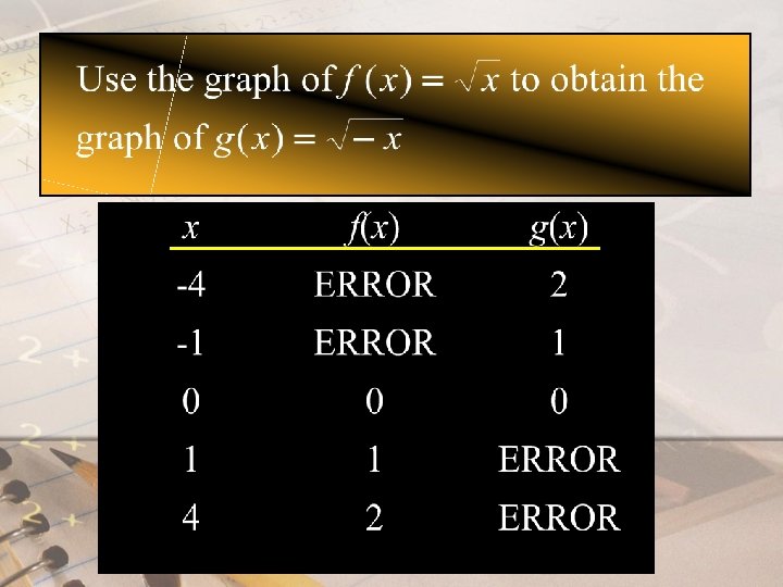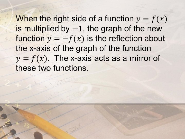 Graphing a New Function from the Original Function New Function Visual Effect Flip over the x-axis. The x-axis acts as your mirror. Flip over the y-axis. The y-axis acts as your mirror.