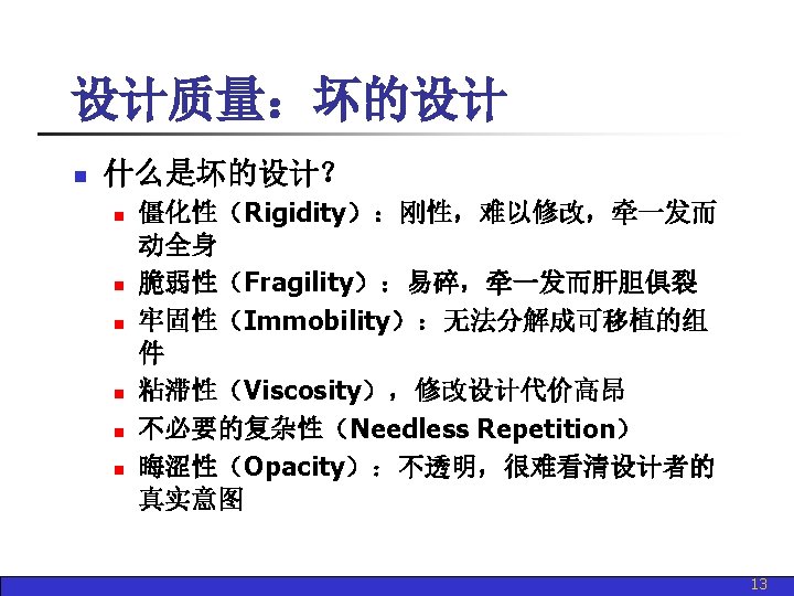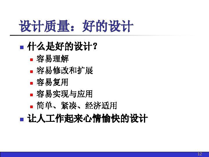设计目标 n n n n 可扩展性 (Extensibility) 灵活性 (Flexibility) 可插入性 (Pluggability) …… 11
