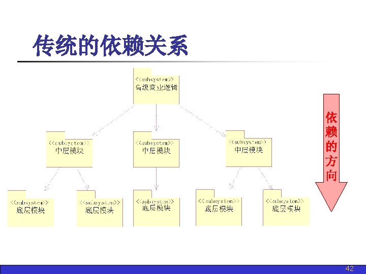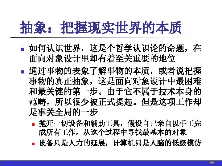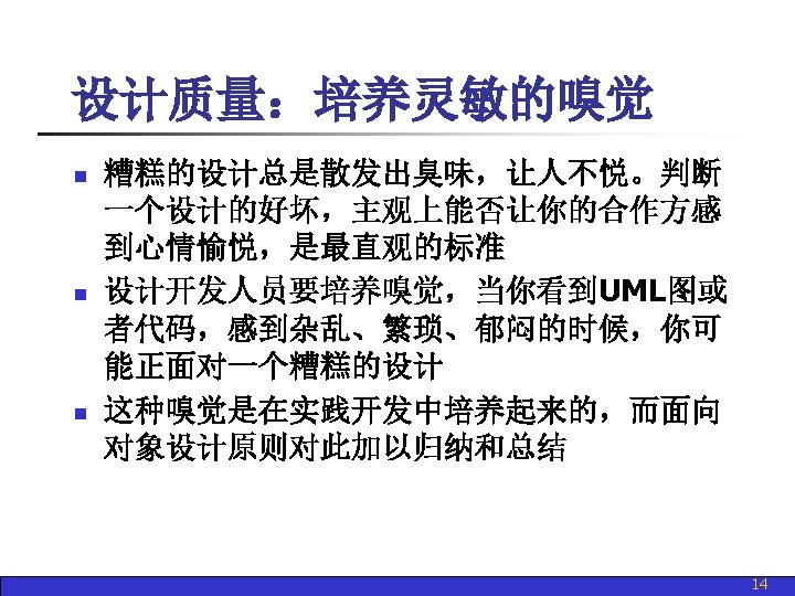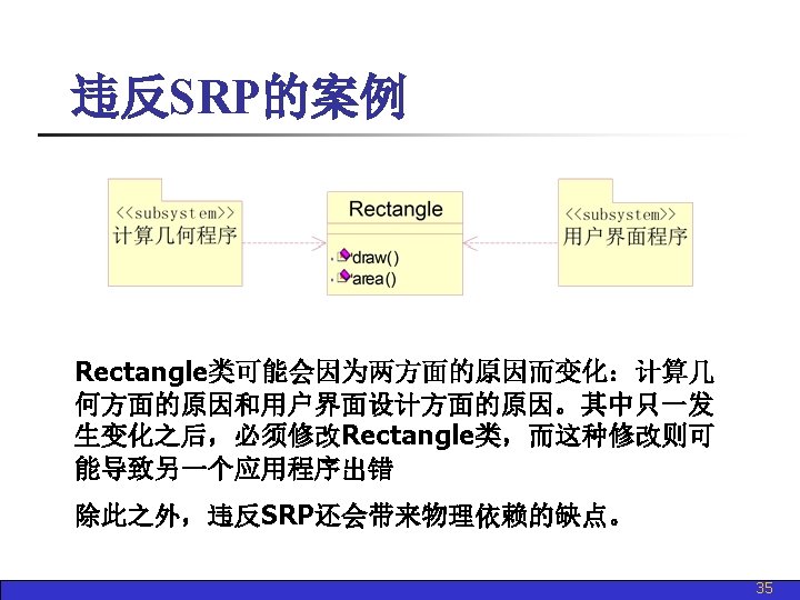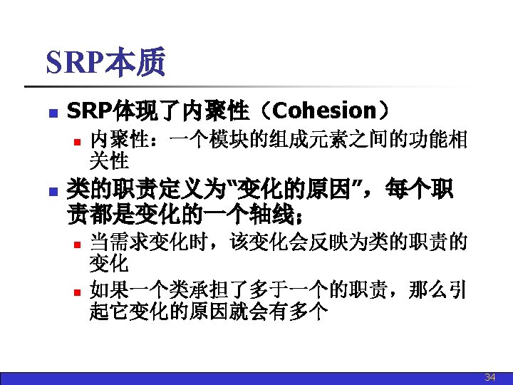 SRP n SRP(The Single Responsibility Principle, 单一职责原则) n n 就一个类而言,应该仅有一个引起它变化的原因 有关类的职责分配问题,是面向对象设计中最 重要的基本原则 “A critical, fundamental ability in OOA/D is to skillfully assign responsibility to software components. ” Craig Larman 33