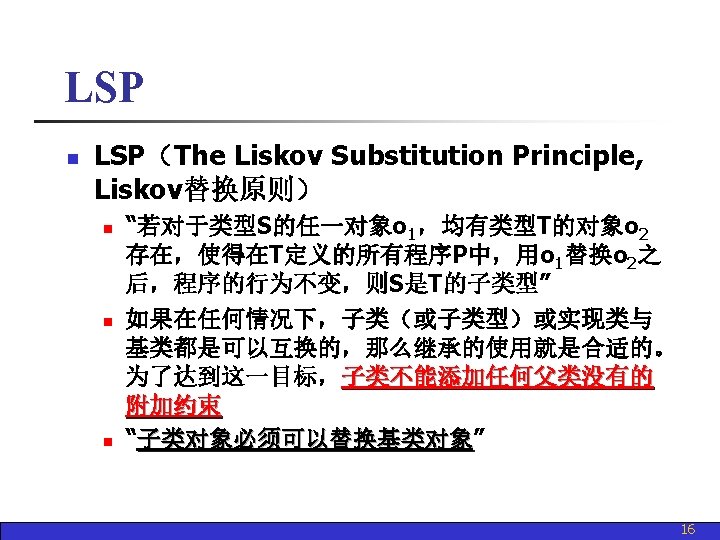 面向对象的基本设计原则 n LSP:Liskov替换原则 n n OCP:开放-封闭原则 n n The Interface Segregation Principle DIP:依赖倒置原则 n n The Single Responsibility Principle ISP:接口隔离原则 n n The Open-Close Principle SRP:单一职责原则 n n The Liskov Substitution Principle The Dependency Inversion Principle …… 15