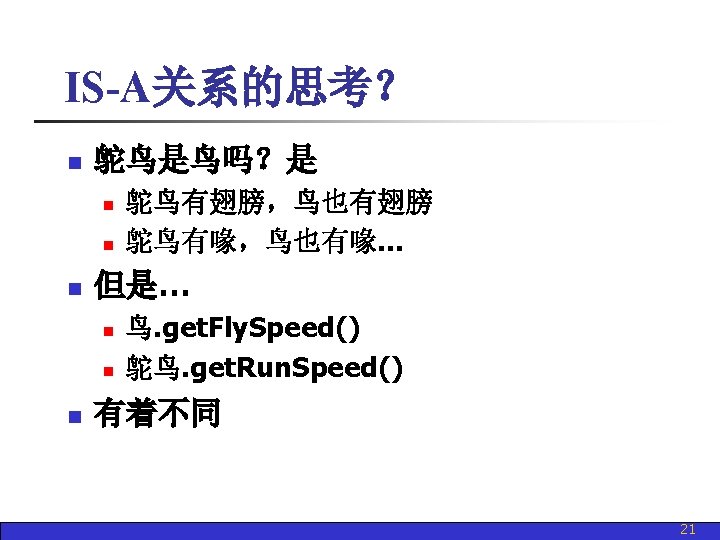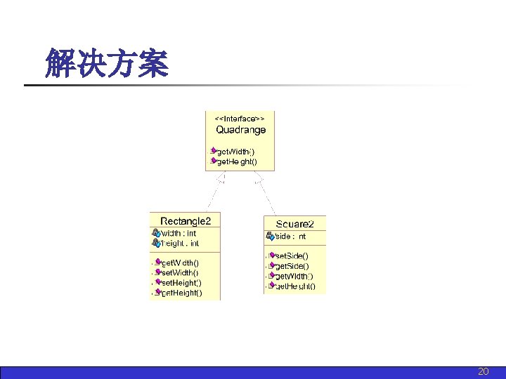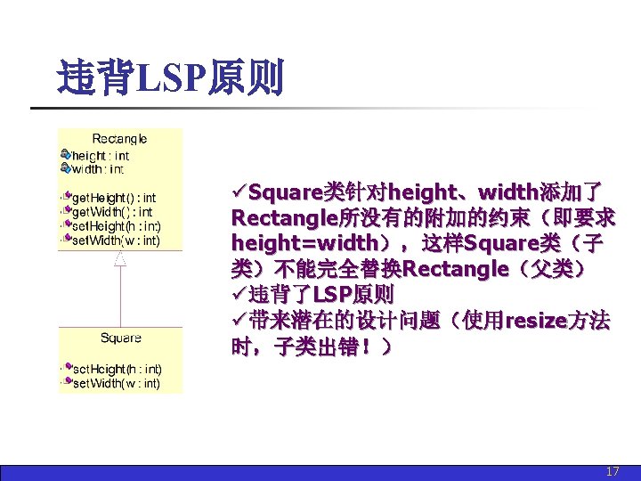 开始设计:正方形 public class Rectangle { private int width; private int height; public void set. Width(int w) { width = w; } public int get. Width() { return width; } public class Square public void set. Height(int h) { extends Rectangle { height = h; public void set. Width(int w) { } super. set. Width (w); public int get. Height() { super. set. Height (w); return height; } } public void set. Height(int h) { } super. set. Width (h); super. set. Height (h) ; } } 7