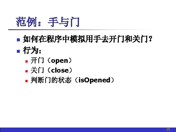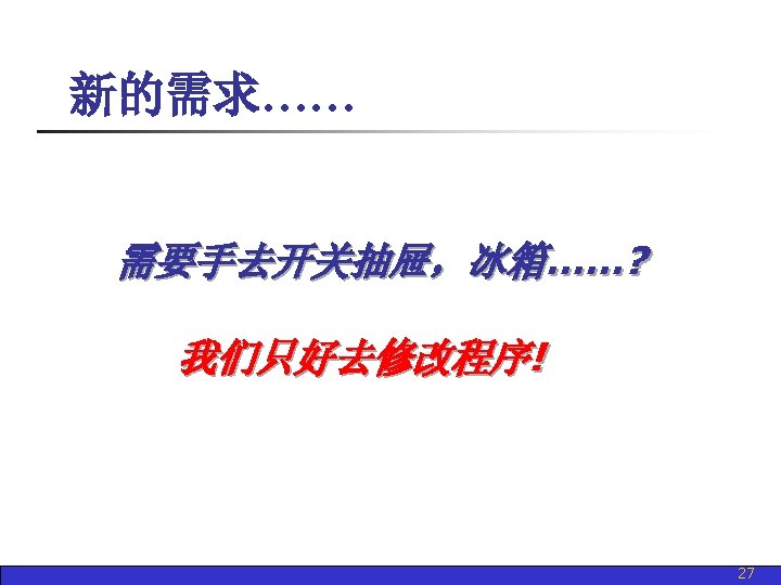 设计实现 public class Door { private boolean _is. Open=false; public boolean is. Open(){ return _is. Open; } public void open(){ _is. Open = true; } public void close(){ _is. Open = false; } } public class Smart. Test { public static void main(String[] args) { Hand my. Hand = new Hand(); my. Hand. door = new Door(); my. Hand. do(); } } public class Hand { public Door door; void do() { if (door. is. Open()) door. close(); else door. open(); } } 26